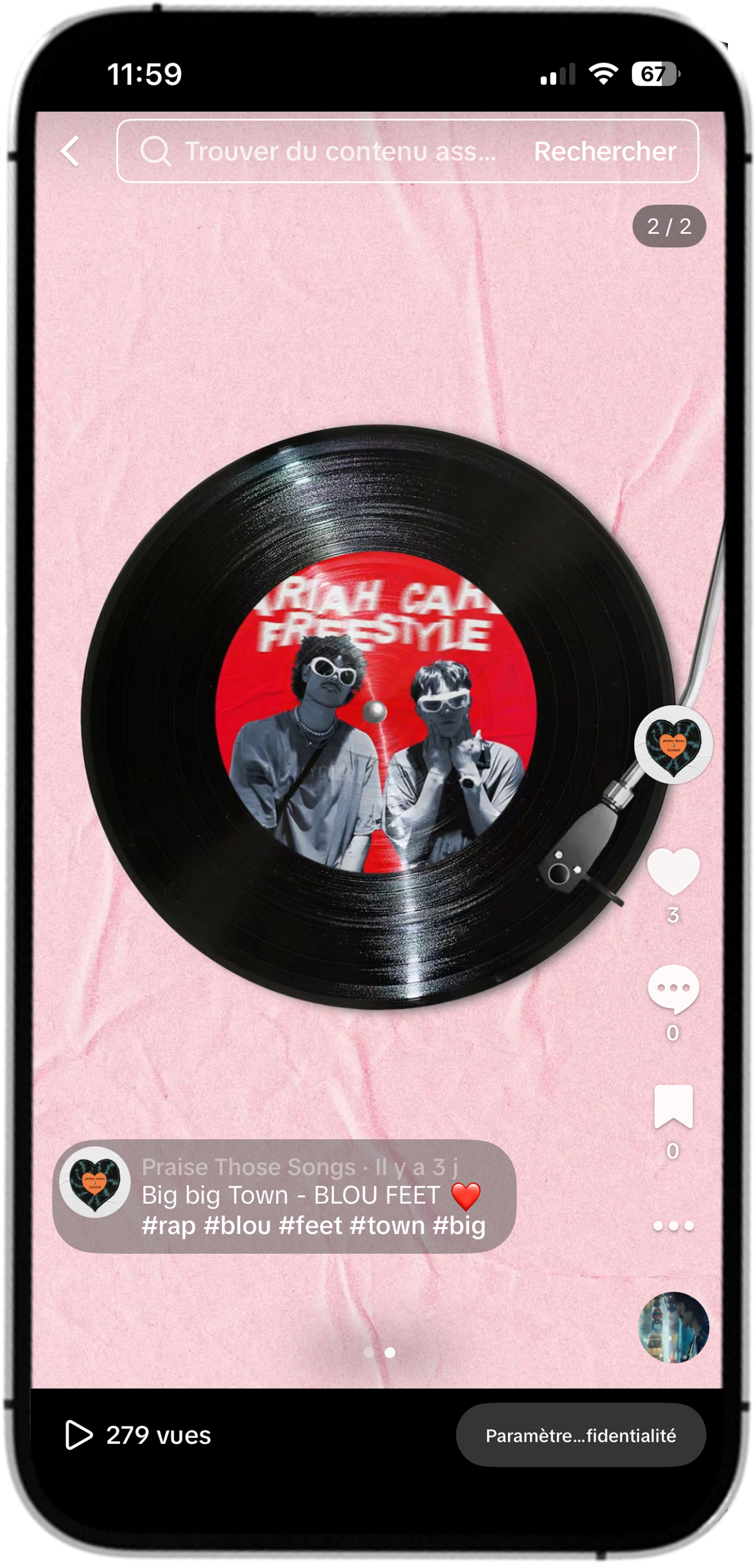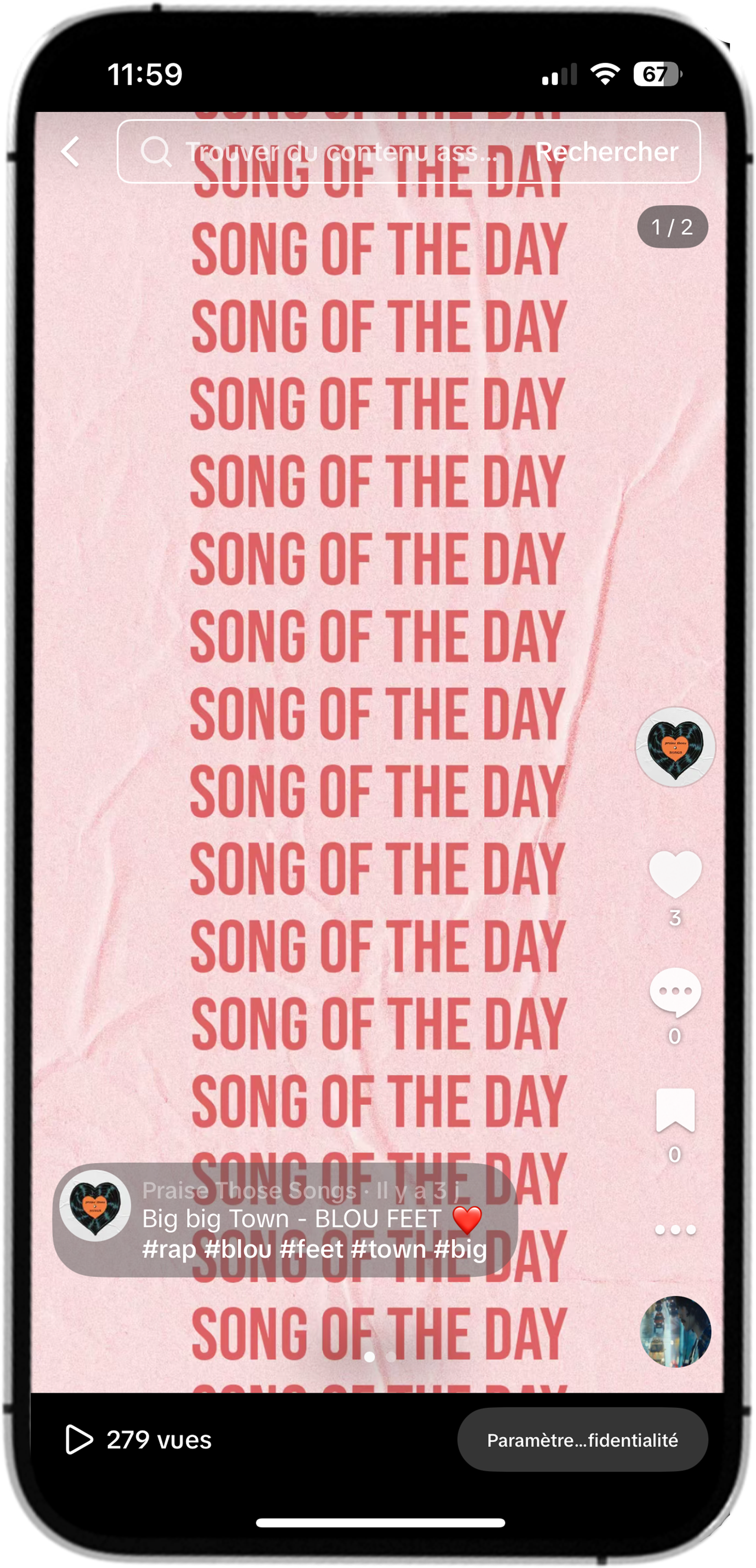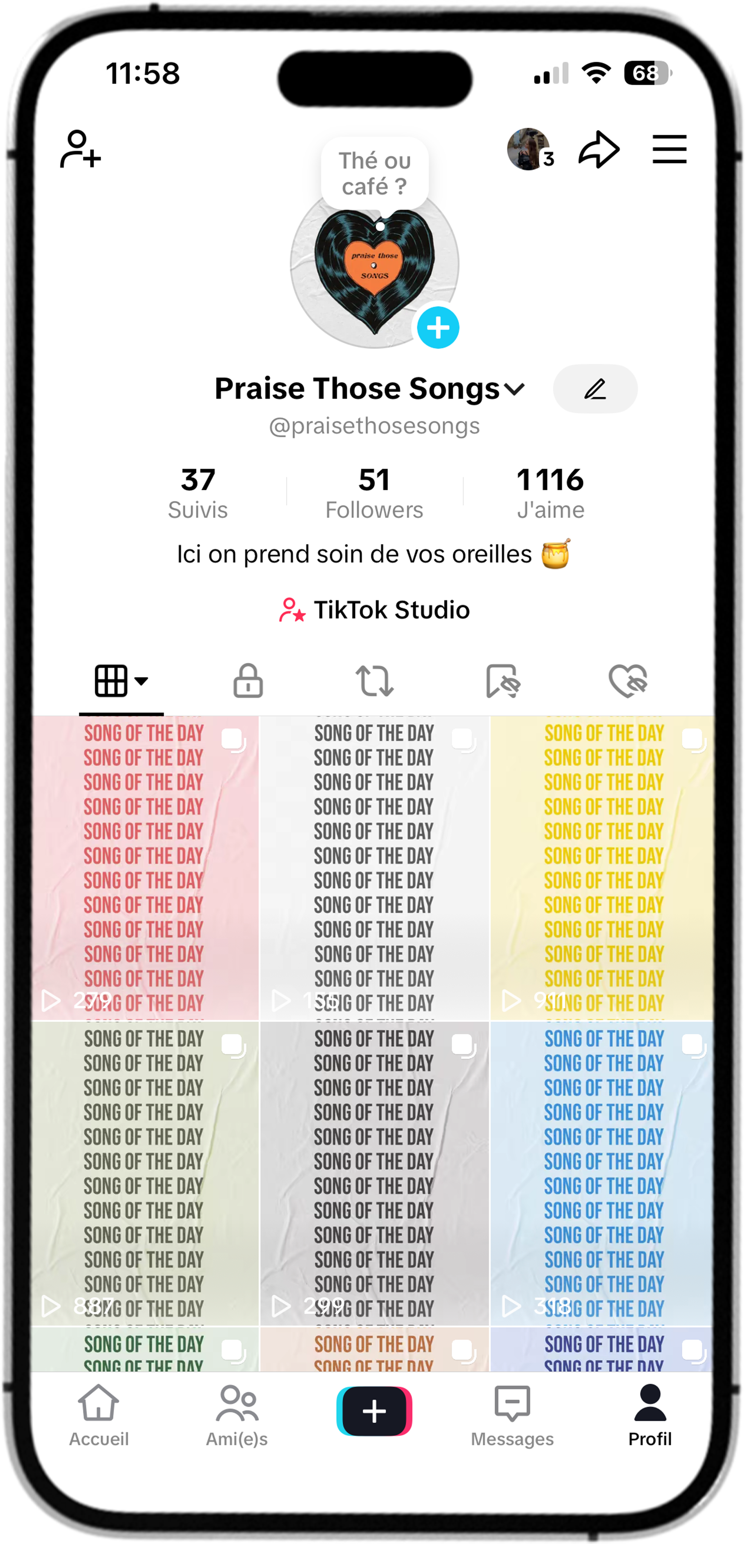 Un compte TikTok dédié au partage de ma passion pour la musique et à la découverte de nouveaux talents. Si vous voulez jeter un oeil, le lien en haut à droite !【ꚠ】